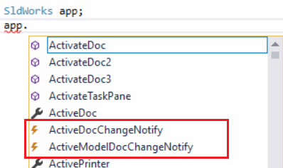 SldWorks로 선언된 변수의 사용 가능한 멤버에 대한 스냅샷입니다 .